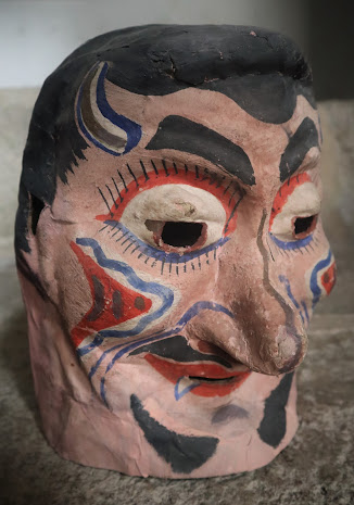 Another is a mold of baked clay, to make a large head. The mask was made in two halves, with pieces of torn newsprint, moistened and fixed to the layers with glue, that is, glue from wheat starch. After drying, the two pieces were joined together, for a few more pieces of glued newspaper and everything was allowed to dry. In the end, it was just painting, with more or less refinement.